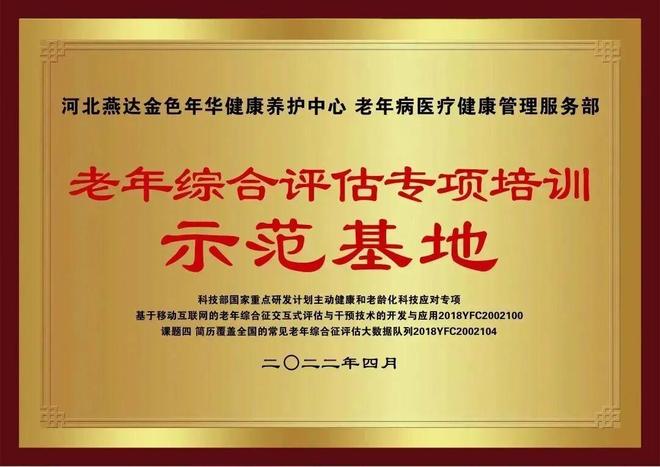 2019年12月,河北省卫生健康委、河北省民政厅联合发文,经各地推荐、资料审核、现场核查等程序,拟确定33家单位为全省首批医养结合优质服务单位,燕达金色年华健康养护中心上榜。